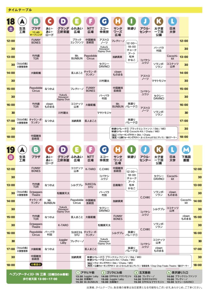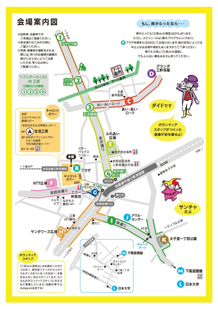 会場案内図・タイムテーブル 投稿日: 2025年10月4日2025年10月7日 投稿者: アートタウン事務局 会場案内図・タイムテーブルを掲載しているパンフレットは、キャロットタワー内(1F観光案内所、5F・3Fチラシラックなど)、フェスティバルに参加している商店街の店舗さん、世田谷区内の施設で配布しているほか、オンラインでも公開しております。 ぜひ、こちらよりダウンロードしてご覧ください。【ダウンロード用】世田谷アートタウン2025『三茶de大道芸』パンフレット(PDF/13MB) ▼パンフレット全体図(ダウンロード版とは異なります)